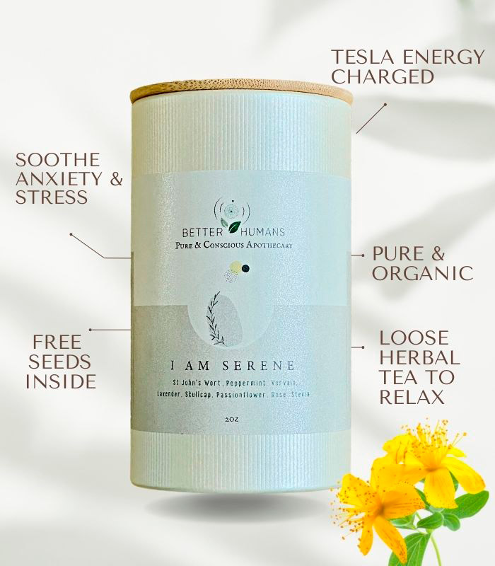 Proprietary blend of St John’s Wort, Peppermint, Vervain, Lavender, Skullcap, Passionflower, Rose, Stevia